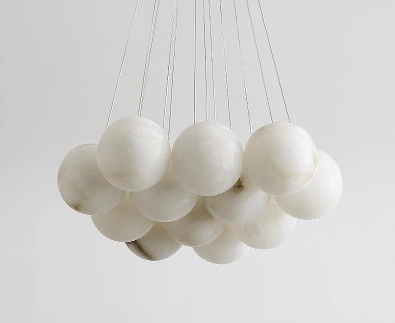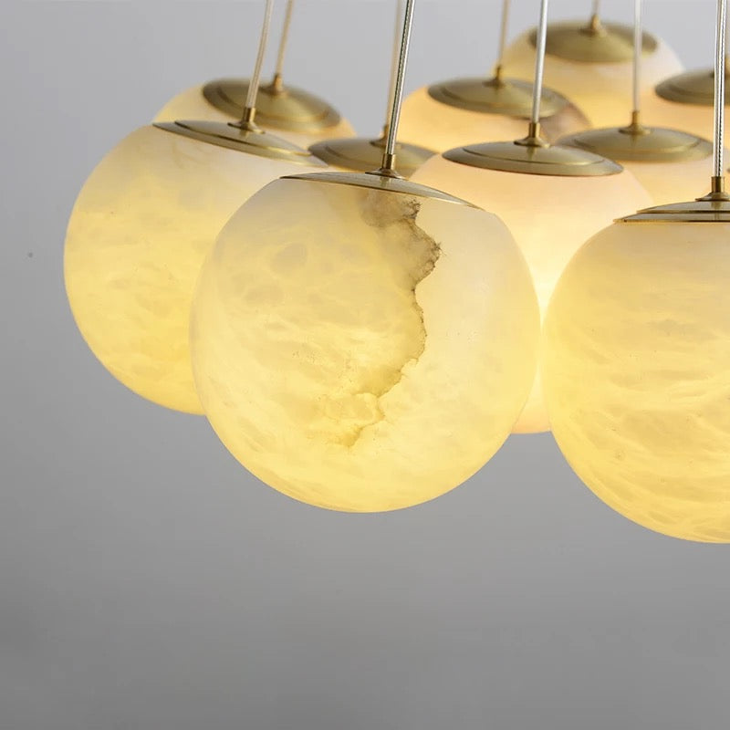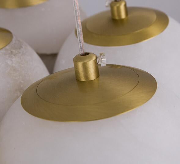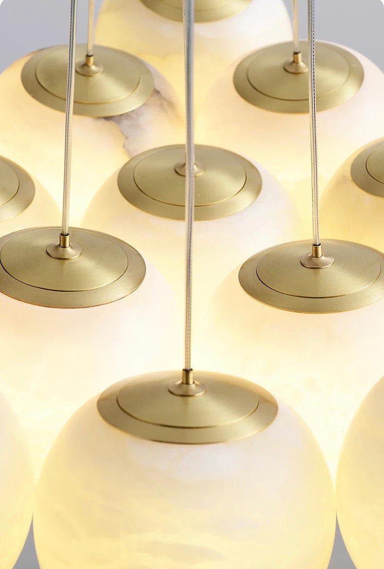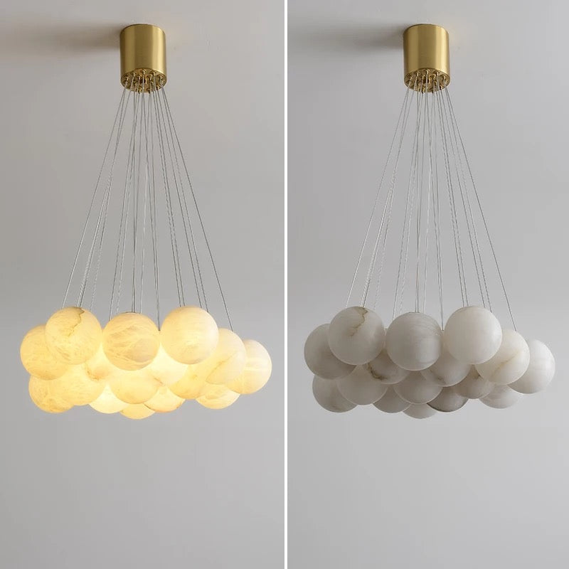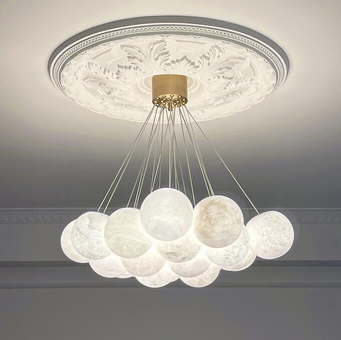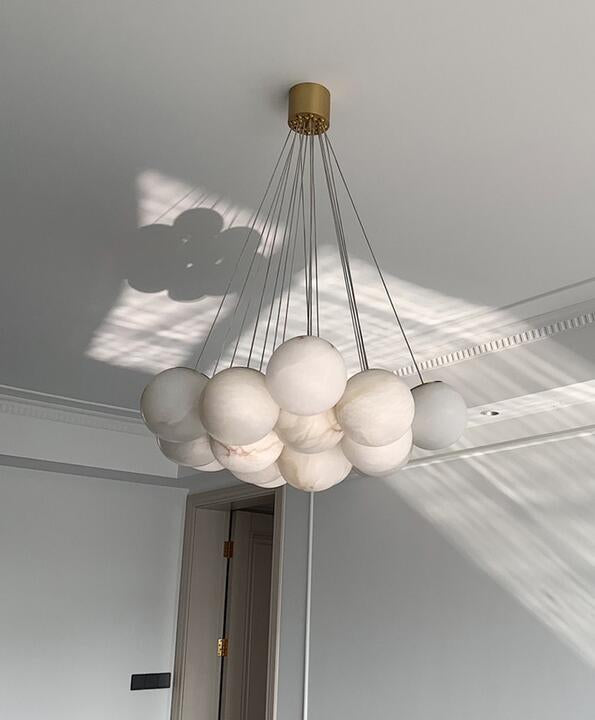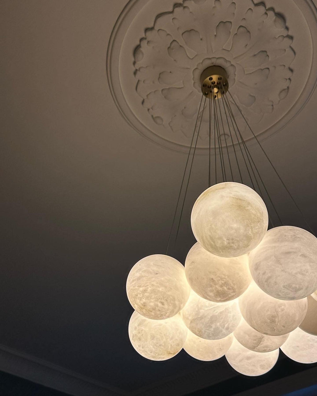 Taklampan Alessandra med sfärer i äkta marmor är en extremt stilren och tidlös taklampa. Alessandra är gjord med sfärer i äkta marmor, vilket innebär att varje lampa är helt unik. Lampan ger ett väldigt fint ljus när den är tänd men den fungerar även som en stilren inredningsdetalj när den är släckt.Själva upphängningen är gjord av borstad mässing.Taklampan finns med marmorkulor i tre olika storlekar: 13 cm och 15 cm i diameter.Trådsnöret som varje marmorkula häng. . .